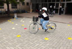 また、自転車運転時の交通ルールの紙芝居の後に、出来るだけゆっくりと自転車を運転するバランストレーニングを