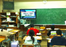 最終回では、危険予知トレーニングの一環として、教室内のモニターで、JATRAS一財日本交通安全教育普及協会制作の